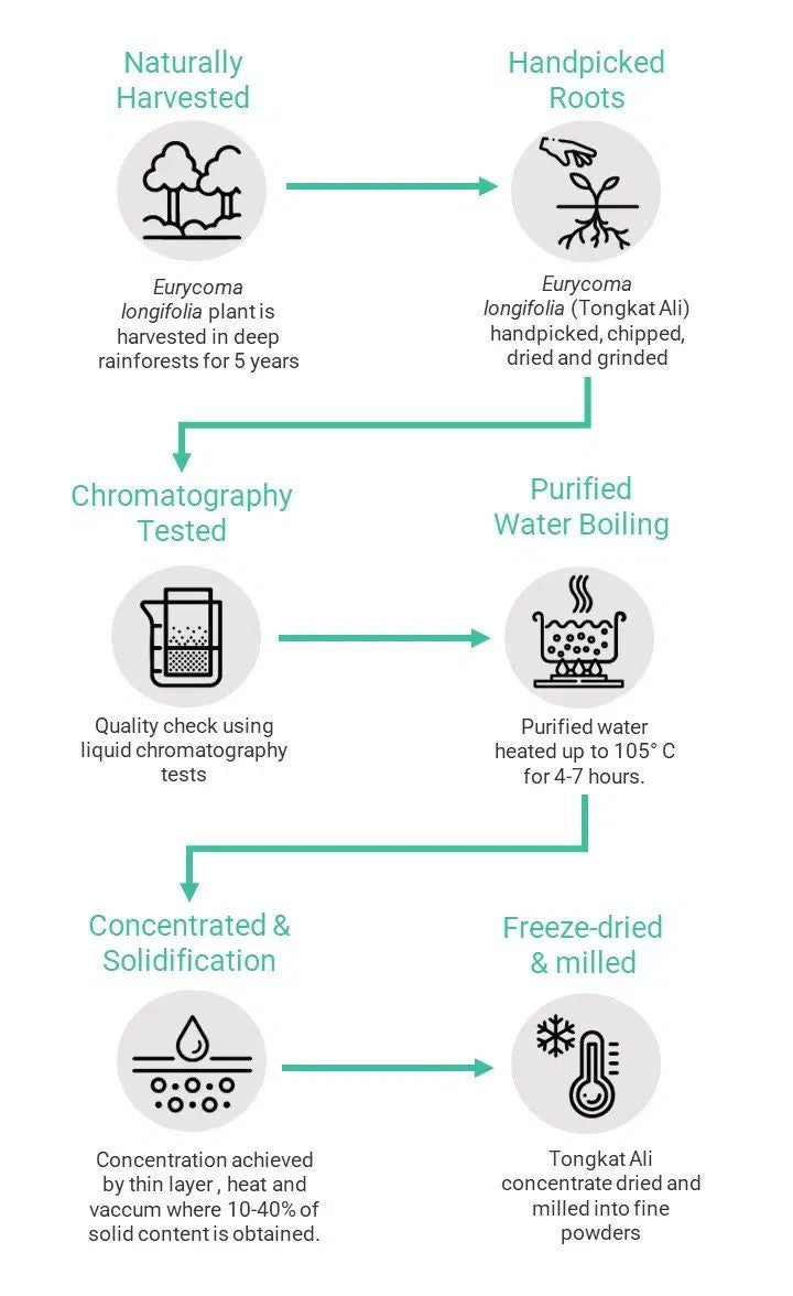 Our Tongkat Ali plant grows in the wild rainforests and is managed by the indigenous tribe in Malaysia. Our sustainable development ensures each Tongkat Ali plant is harvested by hand without damage to the natural environment.